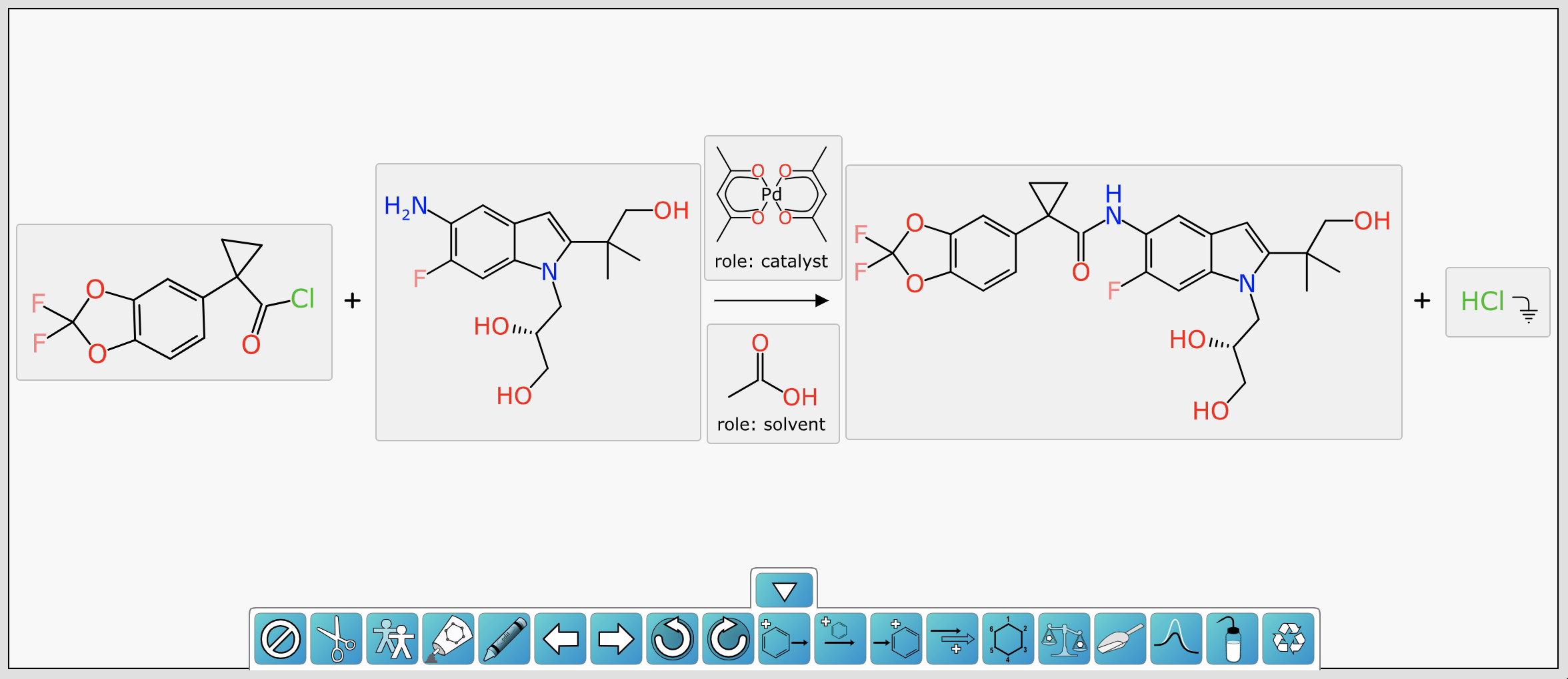 Molecules and reactions are edited using Ketcher, an increasingly popular open source structure editor, which is being actively maintained and improved. The editor operates as per the canvas model, which is another way of saying that when you are drawing a reaction, you need to place the arrows and pluses onto the page and then arrange molecules, text and other drawing objects to your taste. The level of aesthetic control is useful when preparing content for human viewing, but it is not as clearly marked up as a component model (see here for a discussion of the differences).