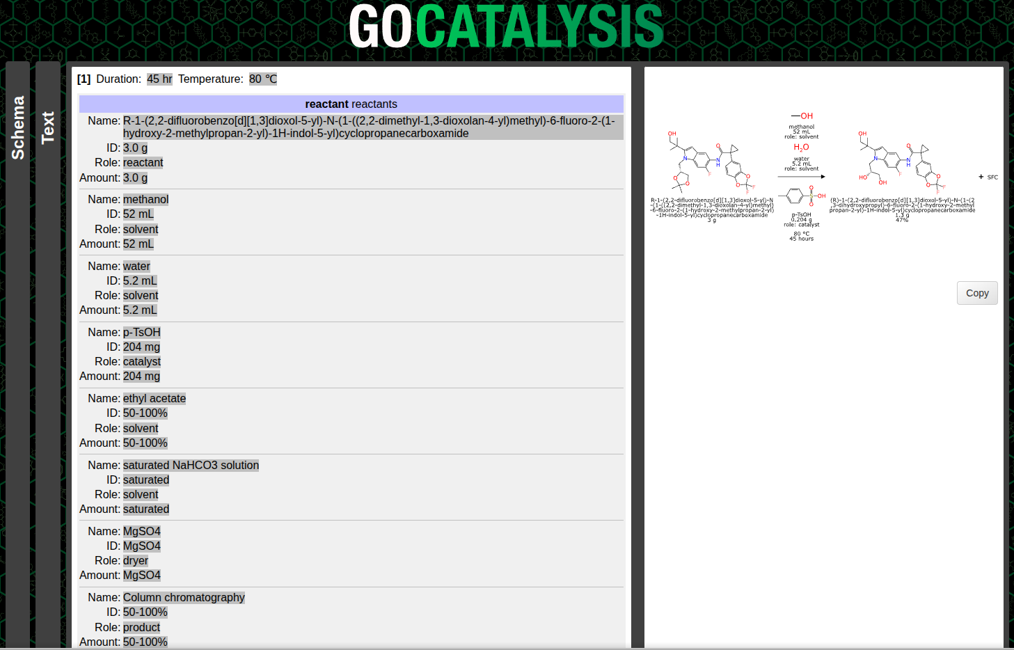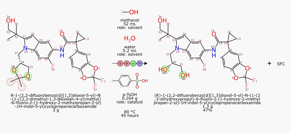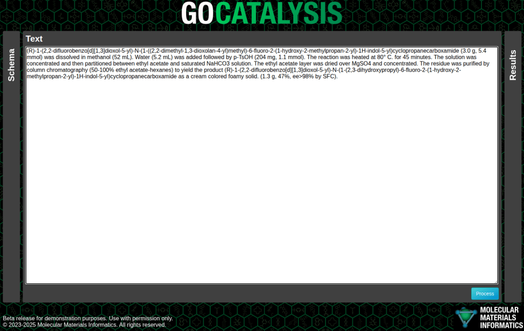 The example below is a fairly concise description of a single step, toward the synthesis of tezacaftor, pasted into the prototype interface:
