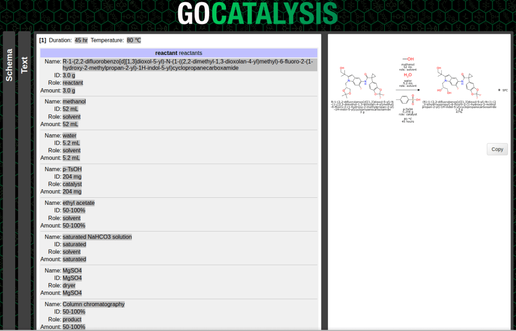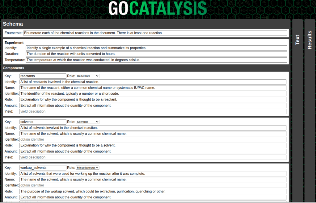 When I finally gave in and tried out a popular chatbot to see if it could unpack a chemical reaction description, I was initially quite stunned by how well it performed: I will admit that I was expecting to have to add an additional layer of domain specific training to get any real value, but it seems like having ingested all of the world’s patents means that that step has already been carried out. I simply asked the model to analyze a paragraph of text describing a chemical reaction and pull out all of the components and put them in a straightforward JSON structure, with some additional fields associated. The performance seemed amazing: it got almost everything right, and was even able to do things like unit conversions, and deconvolute some fairly elaborate descriptions.
