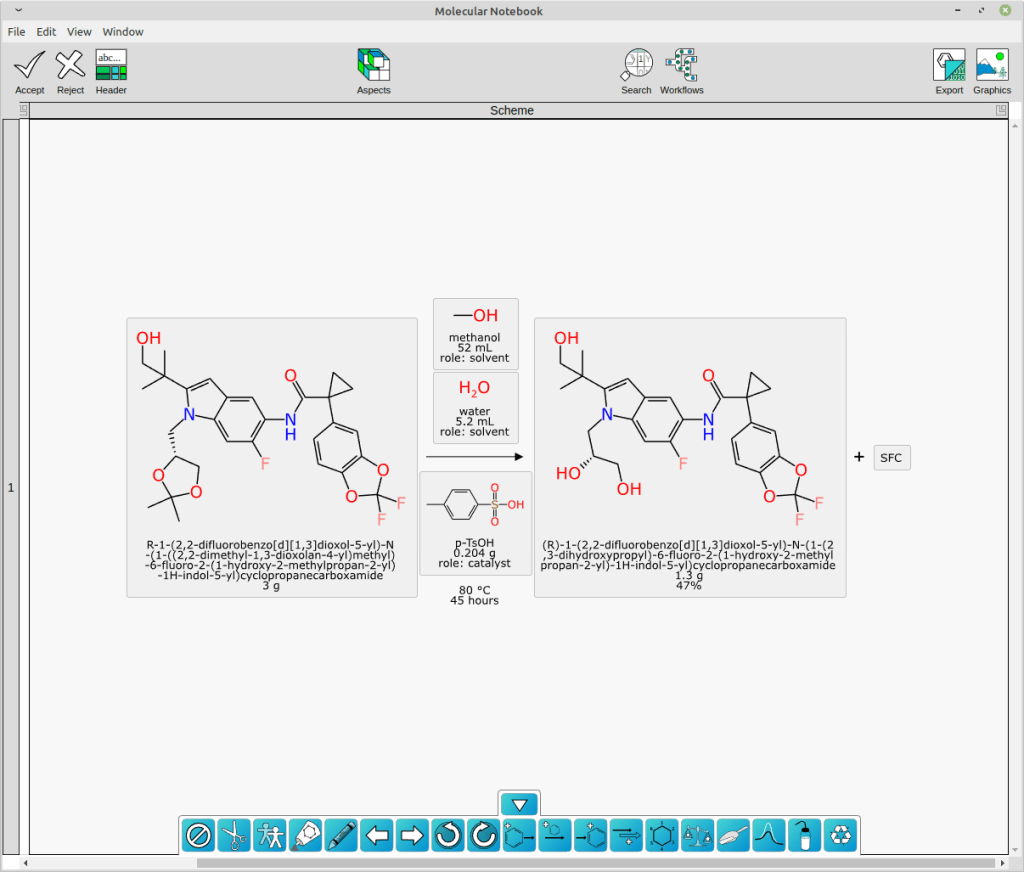 As you can see, the extraction of text content using an open source LLM followed by some domain-specific graph based deep learning models and good old fashioned cheminformatics produced a pretty good result. Not perfect, though: there is still a nonsense product named “SFC” that does not belong there. And full disclosure, I did have to add p-TsOH to my list of custom lookup names.