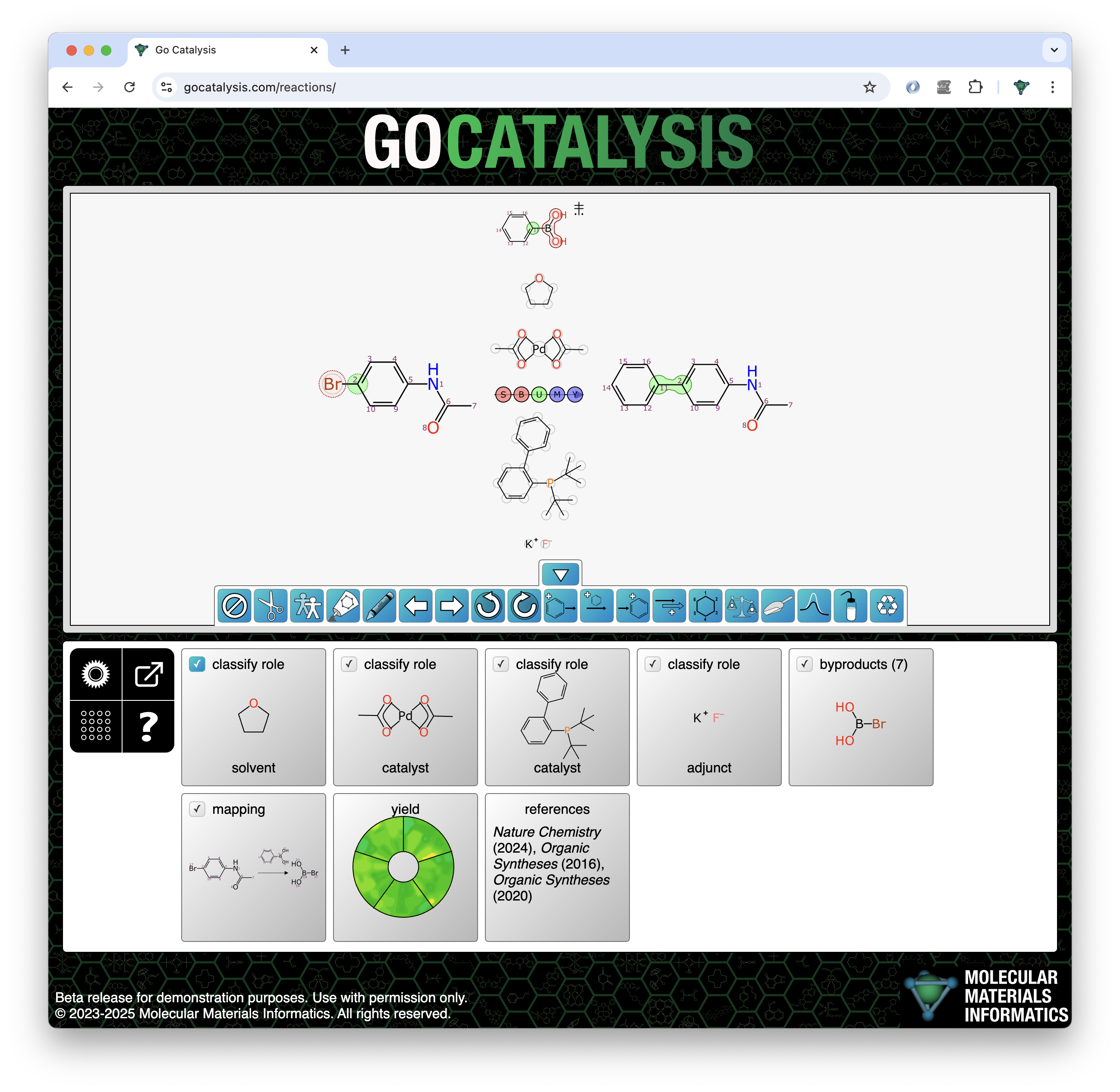 Once the reaction scheme components are all present and marked up, the last step in this toolchain is to propose a coarse-grained set of conditions, namely the duration, temperature and catalyst concentration that is likely to provide the best yield.